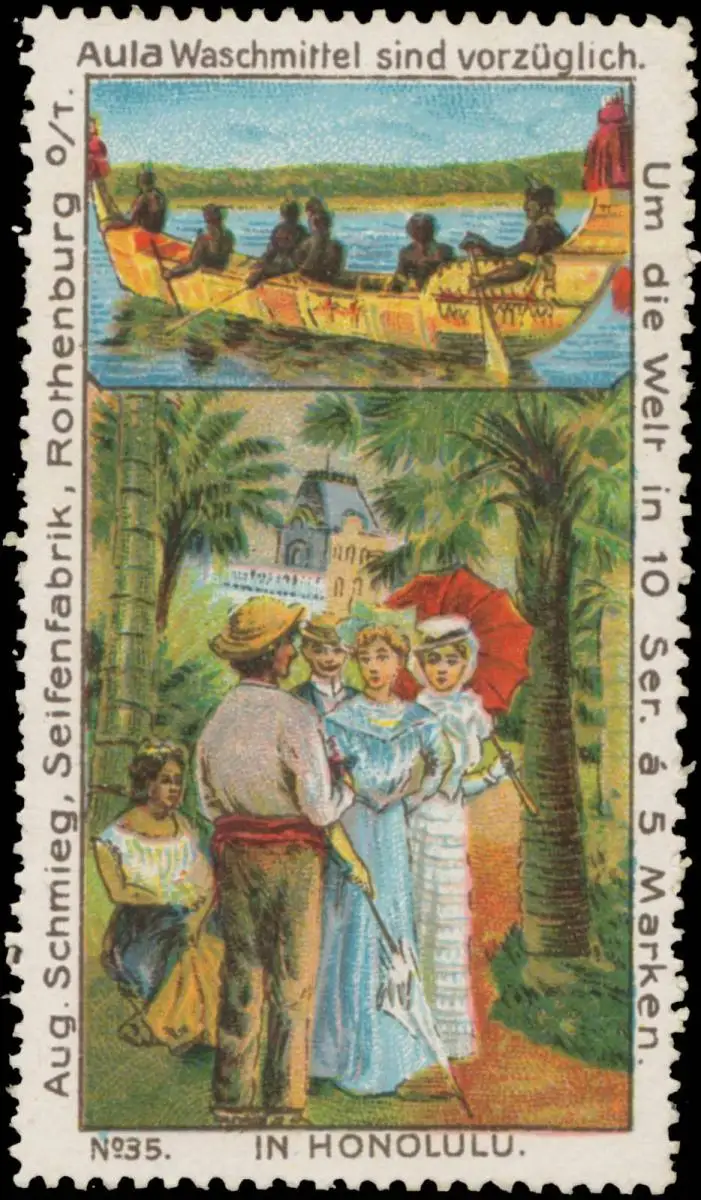 Aula Waschmittel sind vorzüglich. Um die Welt in 10 Serien a 5 Marken. Nr. 35, Größe/Zustand: 7x4 , guter Zustand, Original alte Reklamemarke die seinerzeit für die Werbung benutzt wurde