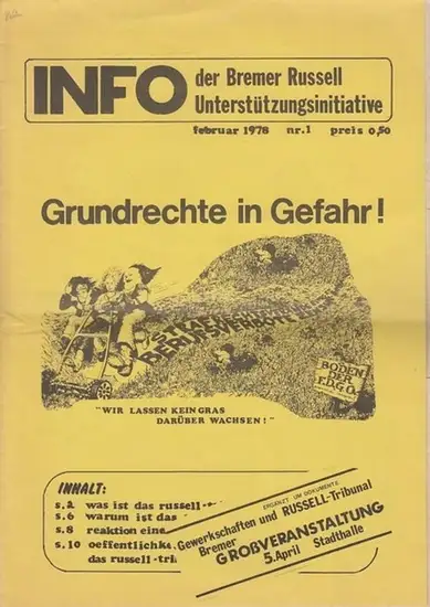 Info der Bremer Russell Unterstützungsinitiative: Info der Bremer Russell Unterstützungsinitiative. Februar 1978, Nr. 1: Grundrechte in Gefahr!. Mitglieder des deutschen Beirats: Ingeborg Drewitz, Helmut Gollwitzer, Wolf D. Narr, Martin Niemöller, Uwe Wes