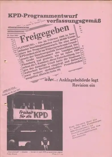 beigelegt: 1) Gutachten des Max Reimann (Leiter der Verhandlungskommission für die Aufhebung des KPD-Verbotes im Flensburger KPD-Prozeß am 23. Juni 1971) - Initiativausschuss für die Wiederzulassung der KPD ( 10 Seiten). 2) Zeugenaussage M.Reimann im Flenburger KPD-Prozeß (7 Seiten). 3) rechtswidriger Willkürakt: Staatsanwaltschaft läßt KPD-Prozeß platzen (4 S.). 4) Jungsozialisten Schleswig-Holsteins diskutieren die Aufhebung des KPD-Verbotes (6 S.). 5) 8 weitere Drucke zum KPD-Thema.