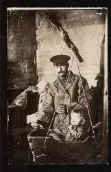 Innenansicht eines Bauernhauses. Bauer mit seiner Tochter im Hintergrund und seinem Sohn in einer Wiege. Sehr seltene Originalaufnahmen. - Nicht gelaufen. (Polen, Russland). .