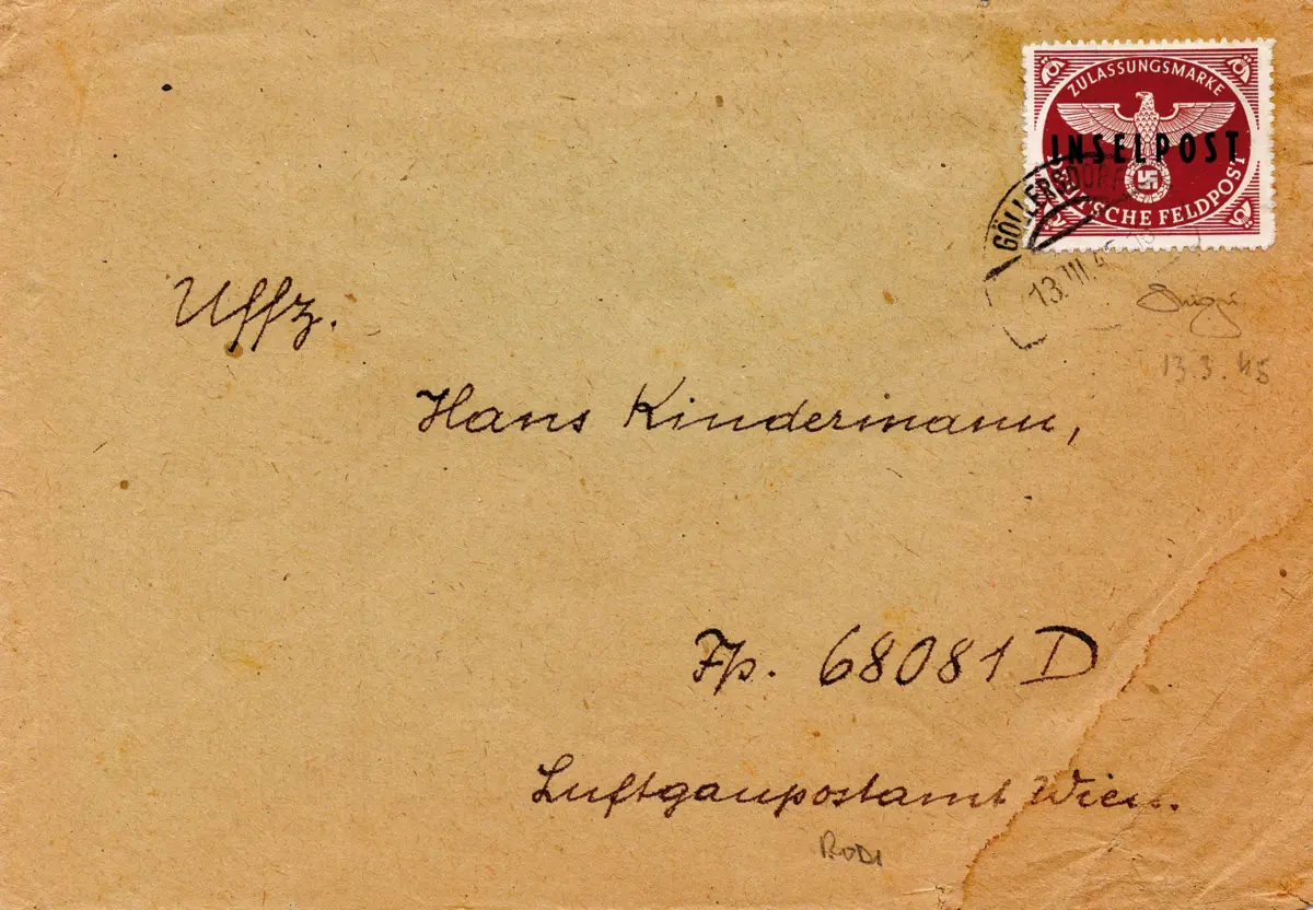 BEUTEL - Inselpost - Rotbraune Rhodosausgabe Nr. 3 Zick-Zack gelocht auf Umschlag vom 13.3.45 von Gollersdorf direkt nach Feldpost 68081D (Rhodos Flottenkommando) - Selten - Zert. Ray. gold - Kat. euro 5.250 Cod.1112/182