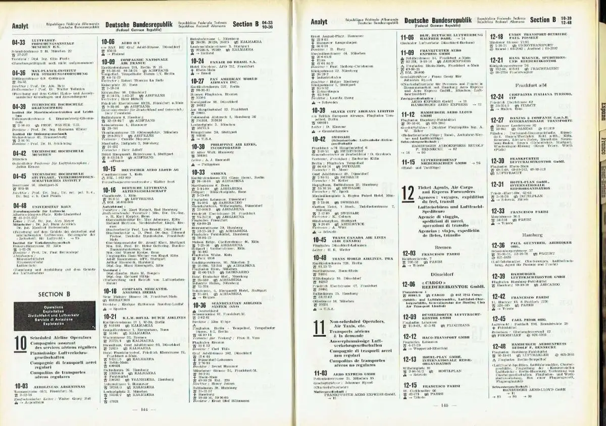 guter Zustand, geringe Gebrauchs- und Alterungsspuren: Einband leicht verschmutzt - Rücken mit Aufkleberresten - Rücken oben gering eingerissen - untere Ecke der Rückseite etwas gestaucht - Titel mit alten Besitzerstempeln und Nummern - Vorsatz etwas kleberfleckig - Papier teils etwas vergilbt, aber Seiten sauber und ordentlich, in deutscher + englischer + französischer + spanischer + italienischer Sprache "Durch den Krieg und die sich anschliessende politische Entwicklung wurde das Erscheinen der vierten Ausgabe (1955) des Adressbuches der Weltluftfahrt INTERAVIA ABC verzögert. Konnte dieses umfangreichste und wichtigste Nachschlagewerk der Weltluftfahrt bis 1939 alljährlich herausgegeben werden, so hielt es der Verlag für angezeigt, eine Neuauflage zurückzustellen, bis einigermassen zuverlässige Unterlagen über Behörden, Militärluftfahrt, Zivilluftfahrt, Industrie, Bodenorganisation usw. in den meisten Ländern wieder verfügbar waren. Die Anfang 1952 in Angriff genommene Neuausgabe ist nunmehr fertiggestellt: Wir legen hiermit das Jahrbuch 1955 vor, damit es eine Lücke schliesst. Gewisse, bei dem Umfang des Werkes unvermeidliche Ungenauigkeiten werden in den weiteren Ausgaben ausgemerzt. Die Einteilung des Buches wurde verbessert, jedoch in ihren Grundzügen beibehalten, da sie sich bewährt hatte : Alphabetisches Firmen- und Namenregister (ALPHABET) — Sachregister (ANALYT), als Hauptteil des Werkes fünfsprachiges Stichwortregister (INDICATOR) — Personenverzeichnis der Weltluftfahrt (WHO IS WHERE) Der Luftfahrtentwicklung entsprechend, wurde der Hauptteil ANALYT erheblich ausgebaut; Kennbuchstaben und Kennzahlen sind für alle Länder die gleichen und erlauben eine genaue Orientierung für sämtliche Haupt- und Nebenzweige der Luftfahrt. Der ANALYT-Schlüssel (Erklärung der Kennbuchstaben und Kennzahlen) findet sich auf dem Lesezeichen; weitere Lesezeichen stehen Beziehern auf Anforderung zur Verfügung; der gleiche ANALYT-Schlüssel findet sich in den fünf verschiedenen Hauptsprachen auf den orangefarbenen Trennkartons der Kontinente sowie in Fussnoten des ALPHABET. Das alphabetische Register ALPHABET deckt den gesamten Inhalt : sämtliche Behörden, Firmen, Flughäfen usw. Das Personenverzeichnis WHO IS WHERE umfasst die Namen von rund 30 000 in der Luftfahrt Tätigen; ihre Beschäftigung und Adresse sind durch die jeweilige Rückverweisung auf die Eintragung im ANALYT erkennbar. Das fünfsprachige Stichwortverzeichnis INDICATOR, ein kurzes Lexikon von Fachausdrücken, ist der Schlüssel für die im ANALYT aufgeführten Erzeugnisse der Luftfahrtindustrie ... Da bei Abschluss der Redaktion verlässliche Unterlagen für das Gebiet nachstehender Staaten — UdSSR, China, Korea, Deutsche Demokratische Republik, Polen, Tschechoslowakei, Ungarn, Bulgarien, Rumänien und Albanien — trotz Anfragen nicht verfügbar wurden, musste auf eine Veröffentlichung über die Luftfahrt dieser Länder verzichtet werden. Die Redaktion der Ausgabe 1955 gilt grundsätzlich als am 30. Juni 1954 abgeschlossen.", Leinen, ca. 22,5 x 30, 1147 Seiten