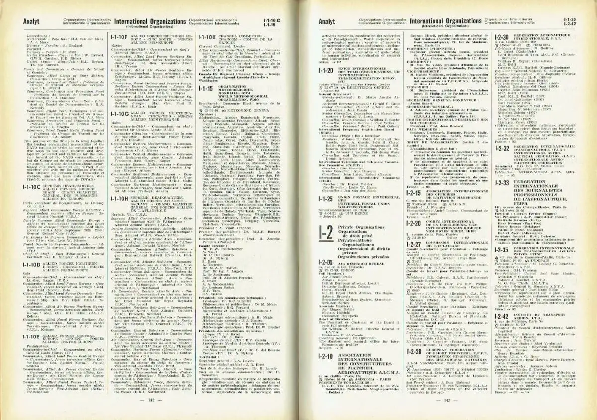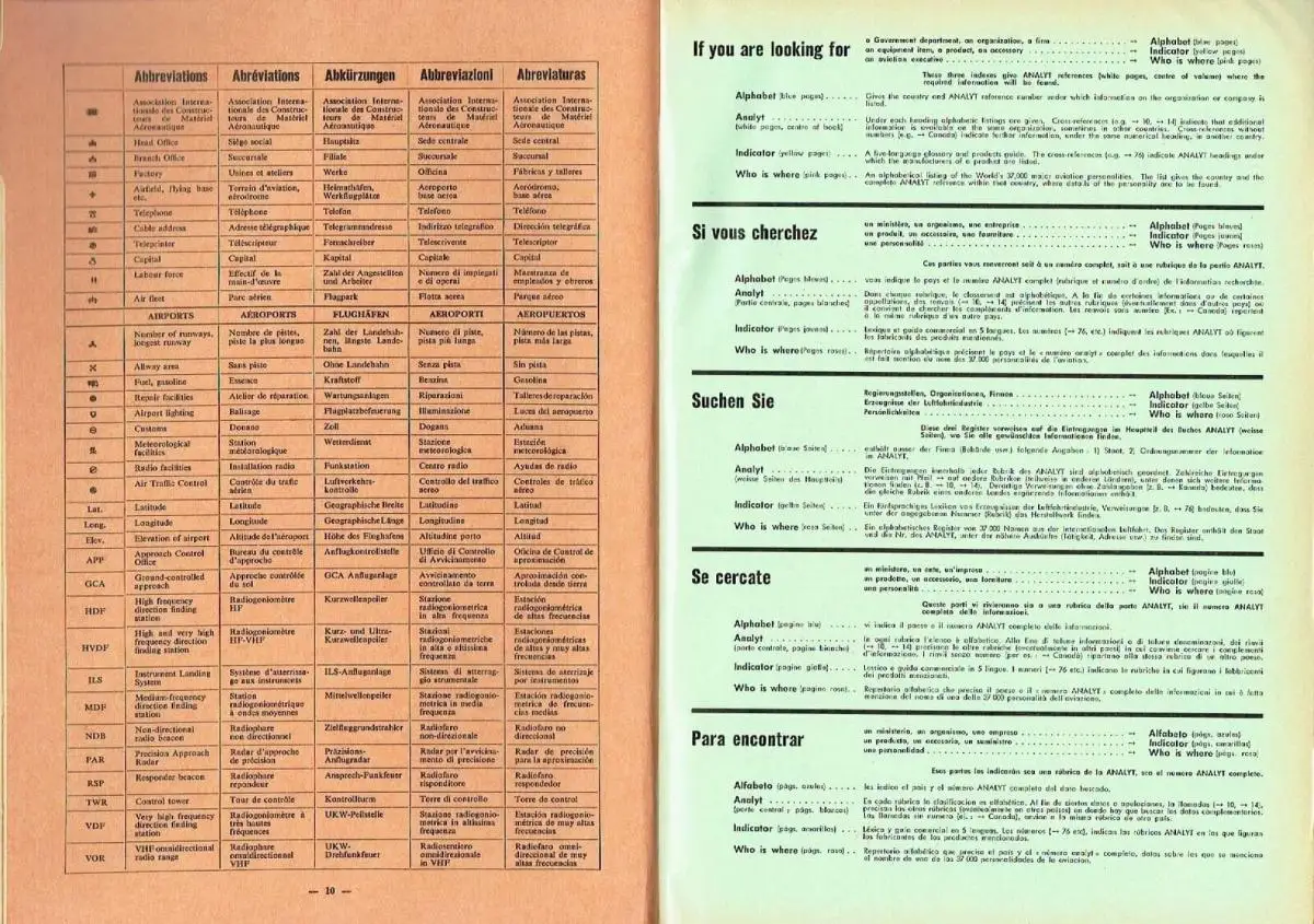 guter Zustand, geringe Gebrauchs- und Alterungsspuren: Einband leicht verschmutzt - Rücken mit Aufkleber - Einband an den oberen Ecken etwas gestaucht - Rücken oben gering eingerissen - Deckel mit kleiner Druckstelle im unteren Rand - Titel mit alten Besitzerstempeln und Nummern - Seiten sauber und ordentlich - Seiten oben teils eselsohrig - überstehende Tabs teils gering abgenutzt oder leicht defekt, in deutscher + englischer + französischer + spanischer + italienischer Sprache - Regierungsstellen, Organisationen, Firmen ‒ Alphabet (blaue Seiten) - Erzeugnisse der Luftfahrtindustrie ‒ Indicator (gelbe Seiten) - Persönlichkeiten ‒ Who is where (rosa Seiten) - Diese drei Register verweisen auf die Eintragungen im Hauptteil des Buches ANALYT (weisse Seiten), wo Sie alle gewünschten Informationen finden. - Alphabet (blaue Seiten) enthält ausser der Firma (Behörde usw.) folgende Angaben: 1) Staat, 2) Ordnungsnummer der Information im ANALYT. - Analyt ‒ Die Eintragungen innerhalb jeder Rubrik des ANALYT sind alphabetisch geordnet. Zahlreiche Eintragungen verweisen mit Pfeil  auf andere Rubriken (teilweise in anderen Ländern), unter denen sich weitere Informationen finden ... Derartige Verweisungen ohne Zahlangaben bedeuten, dass die gleiche Rubrik eines anderen Landes ergänzende Informationen enthält. - Indicator (gelbe Seiten) ‒ Ein fünfsprachiges Lexikon von Erzeugnissen der Luftfahrtindustrie, Verweisungen bedeuten, dass Sie unter der angegebenen Nummer (Rubrik) das Herstellwerk finden. - Who is where (rosa Seiten) ‒ Ein alphabetisches Register von 37000 Namen aus der internationalen Luftfahrt. Das Register enthält den Staat und die Nr. des ANALYT, unter der nähere Auskünfte (Tätigkeit, Adresse usw.) zu finden sind. (weisse Seiten des Hauptteils), Leinen, ca. 22,5 x 30, 1347 Seiten