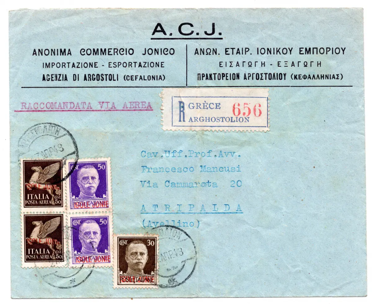 Umschlag - Ionische Inseln - Kaiserreich Cent. 50 aufgedruckte Ionische Inseln Nr. 6 zwei Exemplare + Ergänzung Nr. 5 + Luftpost Nr. 1 x 2 auf Einschreibenumschlag auf dem Luftweg von Argostoli nach Italien am 27.4.43 - Seltener Tarifgebrauch, nicht philatelistisch - gefalteter Umschlag in der Mitte Katalog EuroNr.C. Cod.2235/WEB