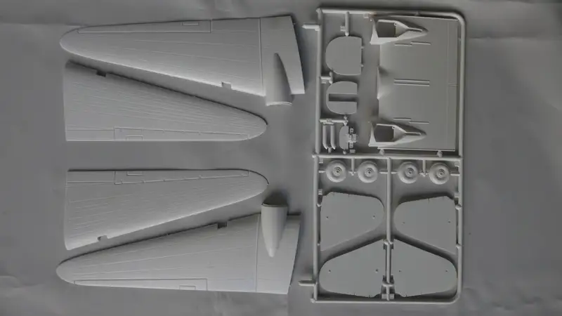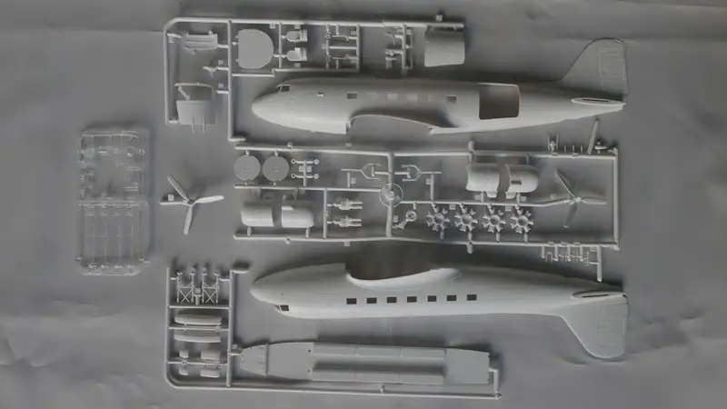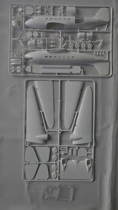 Einzelteile (Plastikbauteile) sind noch am Rahmen fixiert, nicht bei dem Modell Skytrain Dakota C-47.