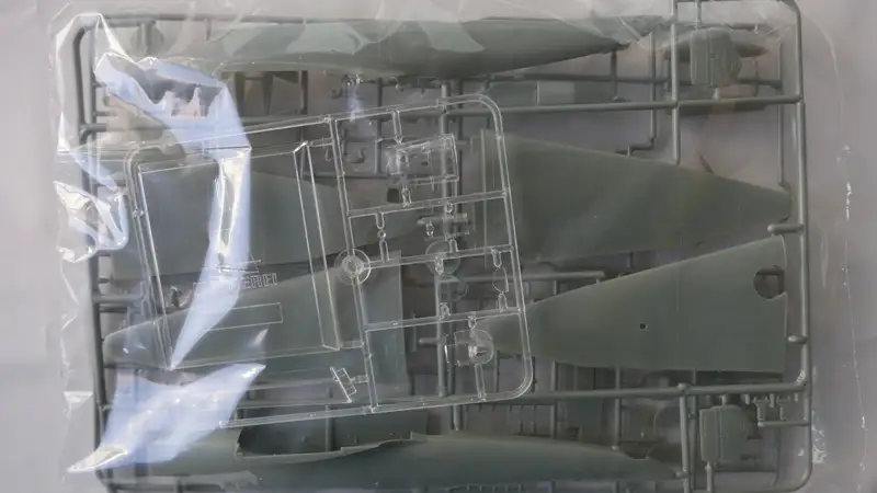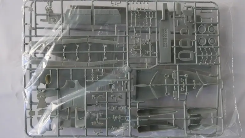 Einzelteile (Plastikbauteile) sind noch am Rahmen fixiert, Sichthülle wurde geöffnet.