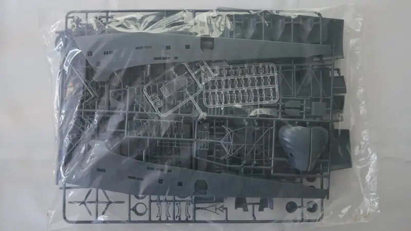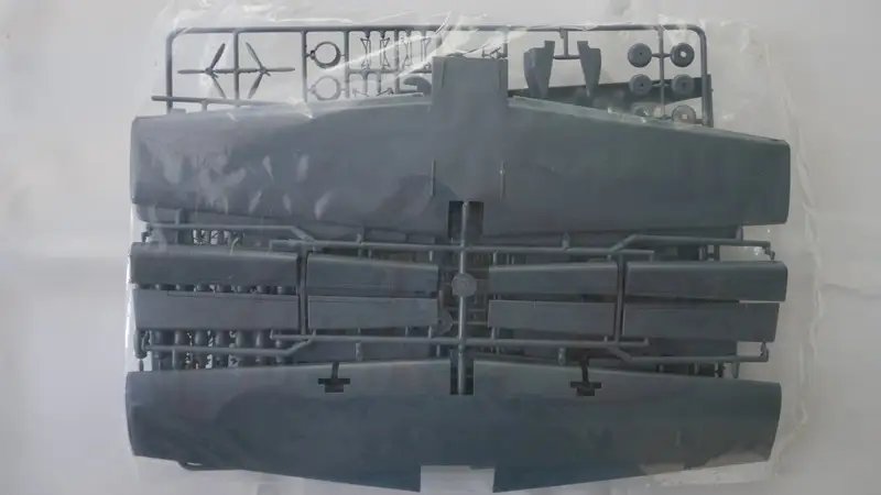 Einzelteile (Plastikbauteile) sind noch am Rahmen fixiert, Sichthülle wurde geöffnet.