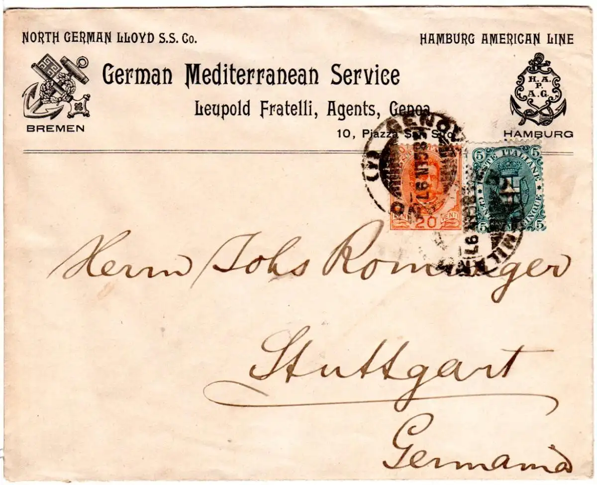 5+20 C. auf Brief v. Genua n. Stuttgart. Vordruckumschlag North German Lloyd S.S.Co. / Hamburg American Line/ Hamburg / Bremen / German Mediterranean Service / Leupold Fratelli, Agents, Genova