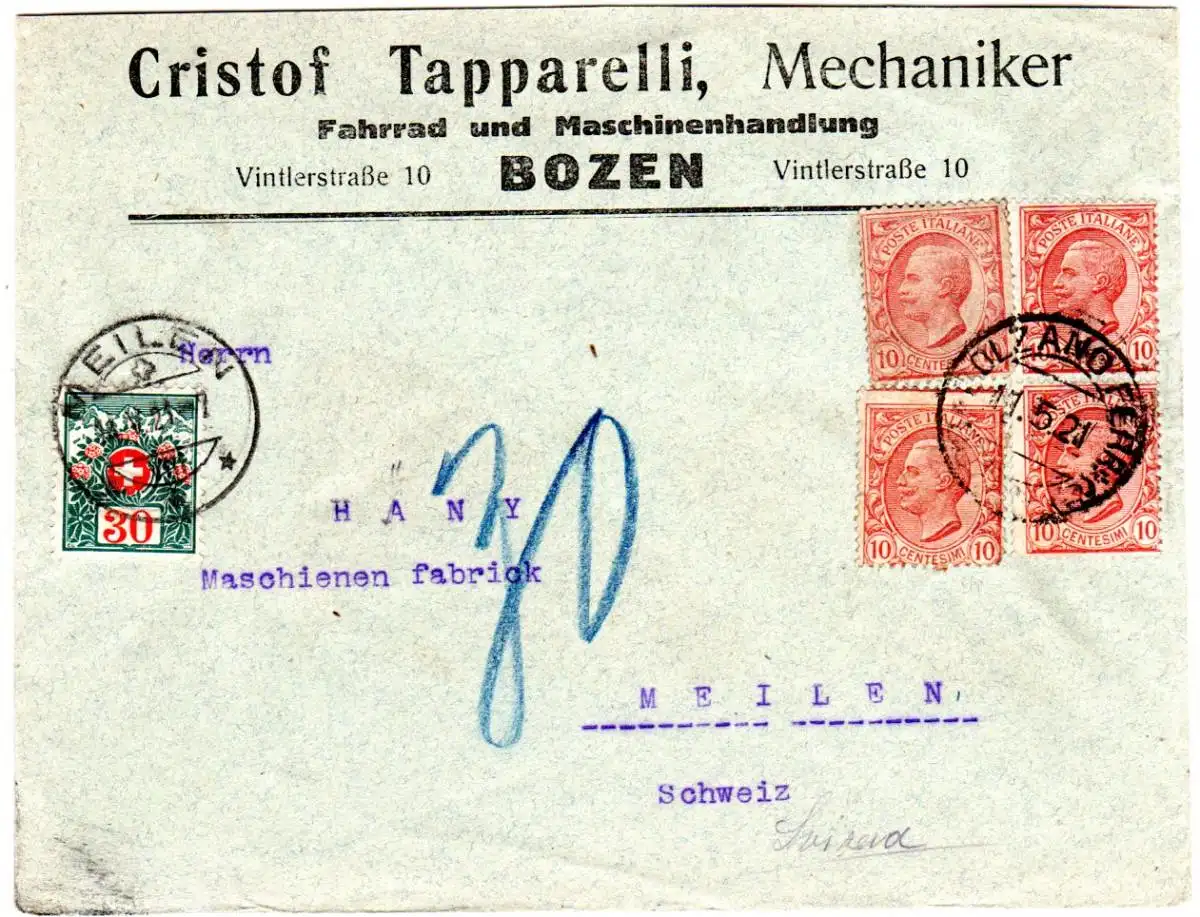 Firmen Vordruckbrief C. Tapparelli, Fahrrad und Maschinenhandlung, Bozen mit 30 C. Schweiz Portomarke.
