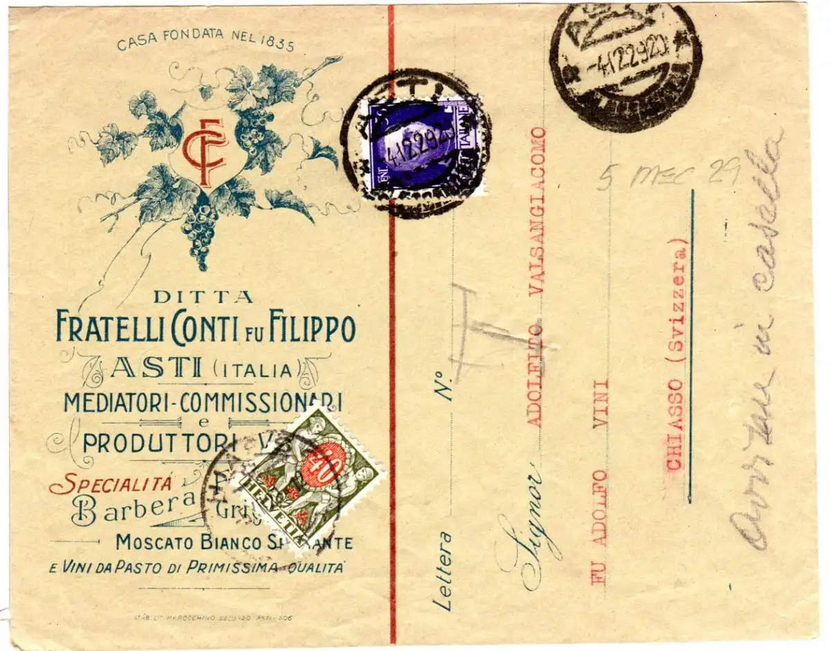 Unzureichend frankierter illustrierter Umschlag der Weinbau Firma Fratelli Fu Filippo v. Asti nach Chiasso, Schweiz mit 40 C. Portomarke.