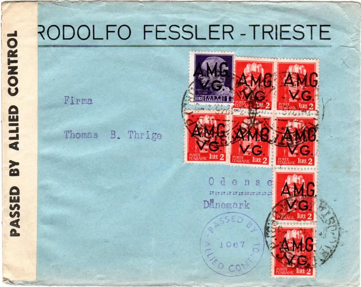 Italien 1946, 8 Werte AMG VG auf Zensur Brief v. Trieste n. Dänemark