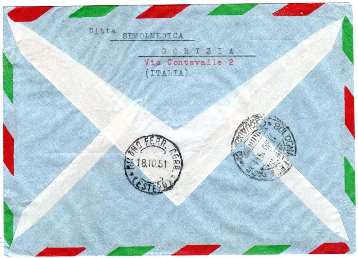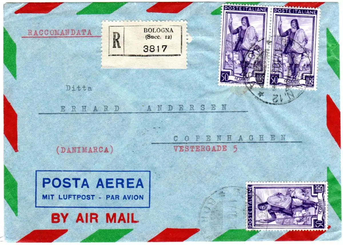 Italien 1951, MeF 3x50 L. auf Luftpost Einschreiben Brief v. Bologna n. Dänemark