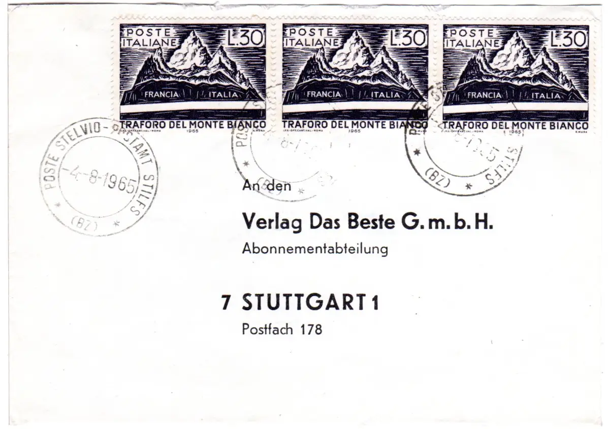Italien 1965, MeF 3x30 L. Mont Blanc Tunnel auf Brief v. Stelvio Stilfs n. Dt.