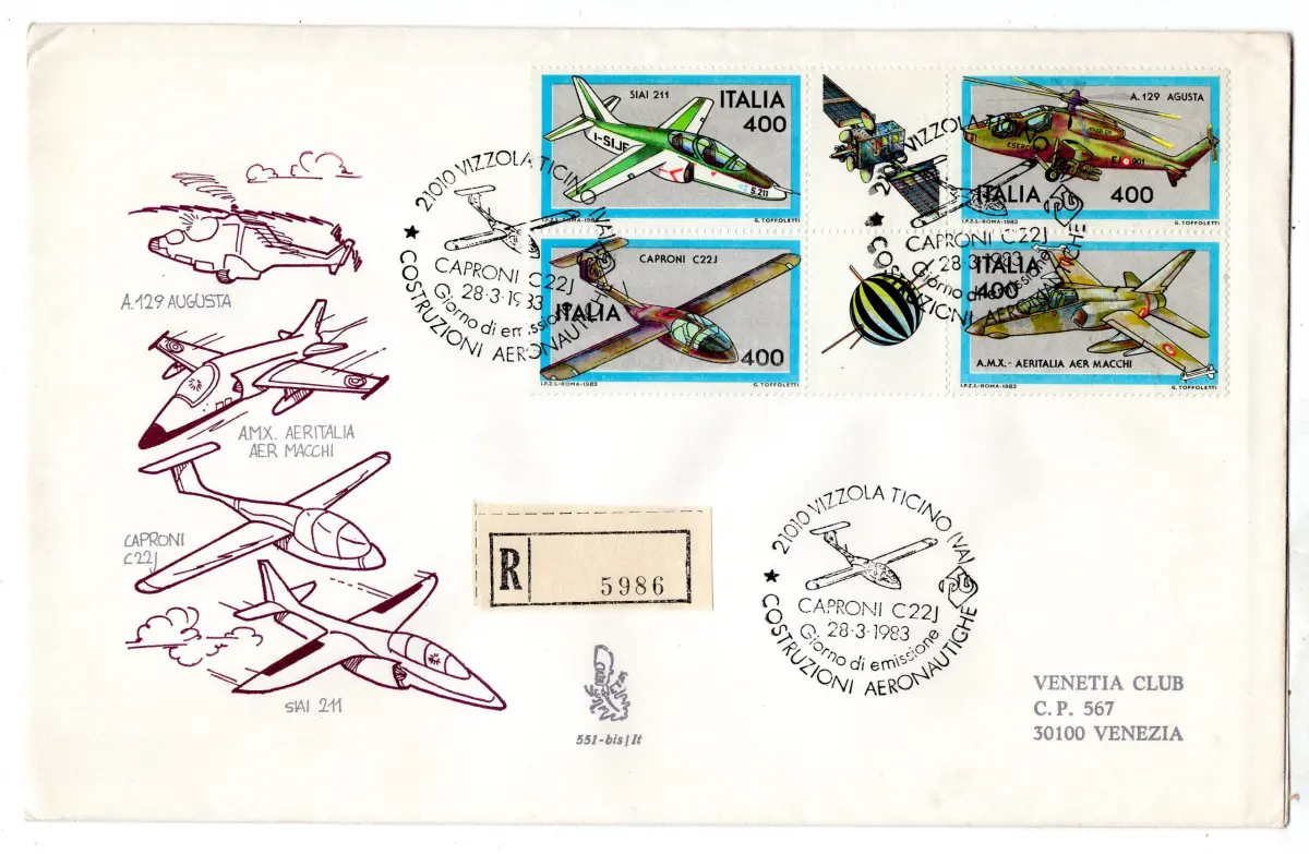 Italien 1983 Flugzeugbau Block auf FDC Venetien Nr. 551/bis gereist Einschreiben mit Stornierung der Ankunft - Hausliste Euro 39 - Cod. 1670/WEB