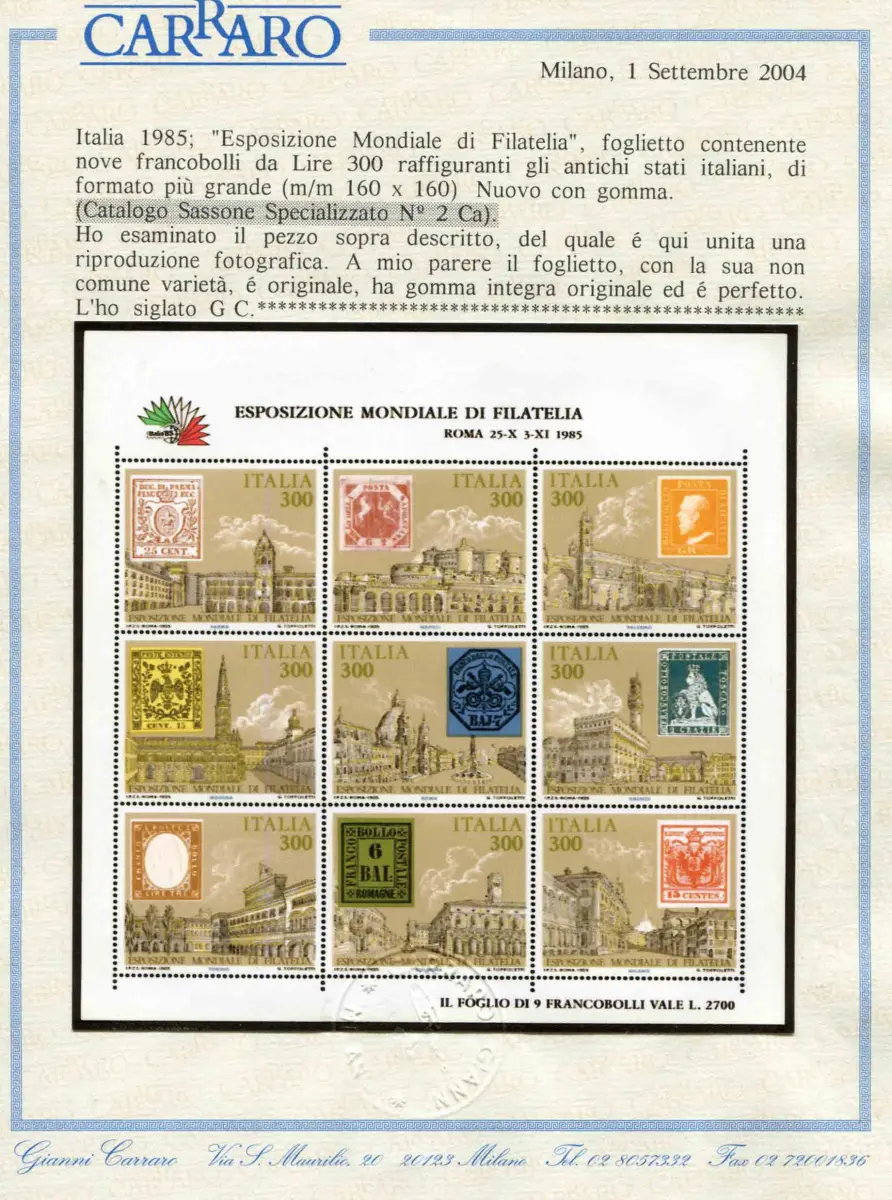 Italien '85 - Das Blatt Alte Staaten Sorte höchste Format Vollgummi - Italien '85 - Das Blatt Alte Staaten Nr. 2c höheres Format - Größe mm. 160 statt 150 - Ungewöhnlich - Zert. Carraro - Kat. euro 500 n. 698/6