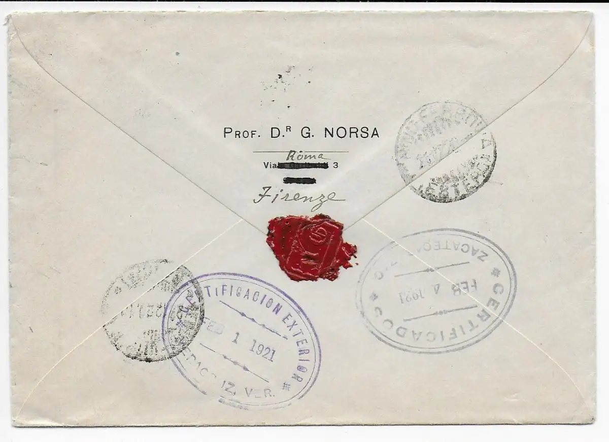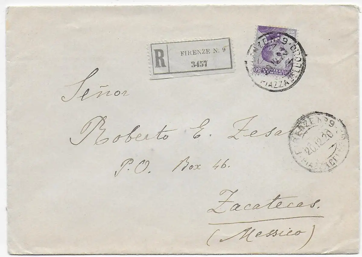 Italien: Einschreiben Firenze 1920 nach Zacatecas/Mexiko