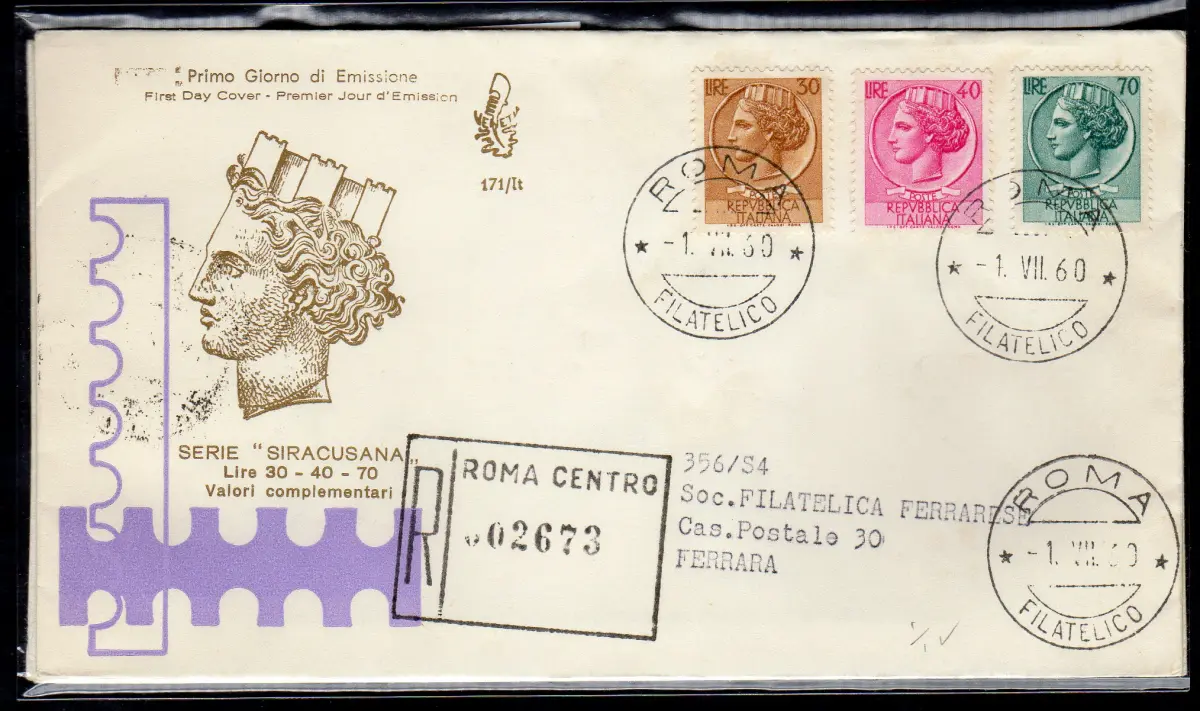 Italien FDC Venetia 1960 Syrakus gereist Racc. für Italien Italien Italien 1960 Syrakus auf FDC Umschlag gereist Racc. für Italien mit Annullierung der Ankunft Annullo Roma Philatelico - Text in einer Zeile in der Farbe hellblau Cod. 491/Venetia