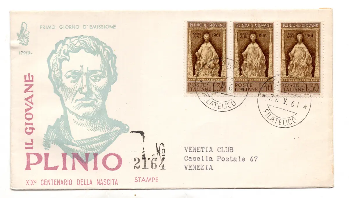 Italien FDC Venetia 1961 Plinius der Jüngere Dreierstreifen gereist Racc. für Italien Italien Italien 1961 Plinius der Jüngere Dreierstreifen auf FDC Umschlag gereist Racc. für Italien mit Annullierung der Ankunft Cod. 508 / Venetien