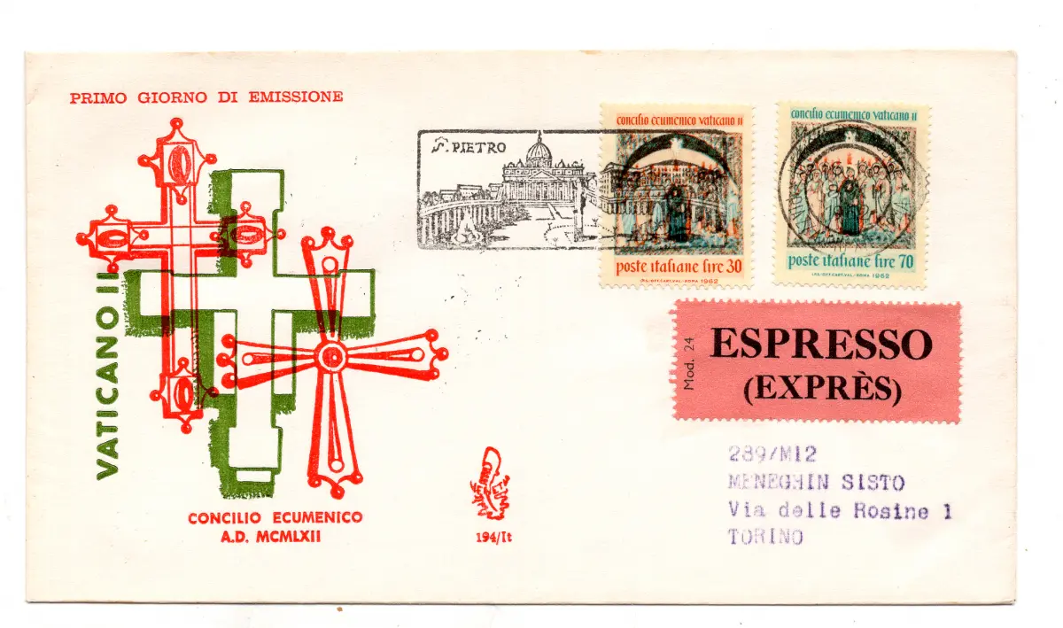 Italien FDC Venedig 1962 Ökumenisches Konzil reiste nach Italien Italien 1962 Ökumenisches Konzil auf Umschlag FDC reiste nach Italien mit Annullierung der Ankunft - Abreise - Annullierung Figurato PT Mobile di Piazza San Pietro i Piazza Pio XII Cod. 1527/Venetia
