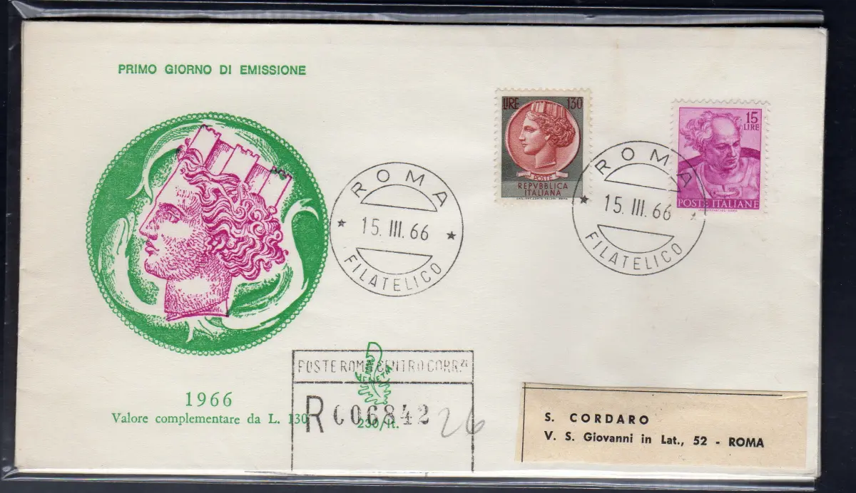 Italien FDC Venetia 1966 Syrakus Lire 130 gereist Racc. für Italien Italien Italien 1966 Syrakus Lire 130 auf Reiseumschlag Racc. für Italien mit Annullierung der Ankunft Annullo Roma Philatelico - Zusatzfrankatur Lire 15 Michelangelo Cod. 676/Venetia