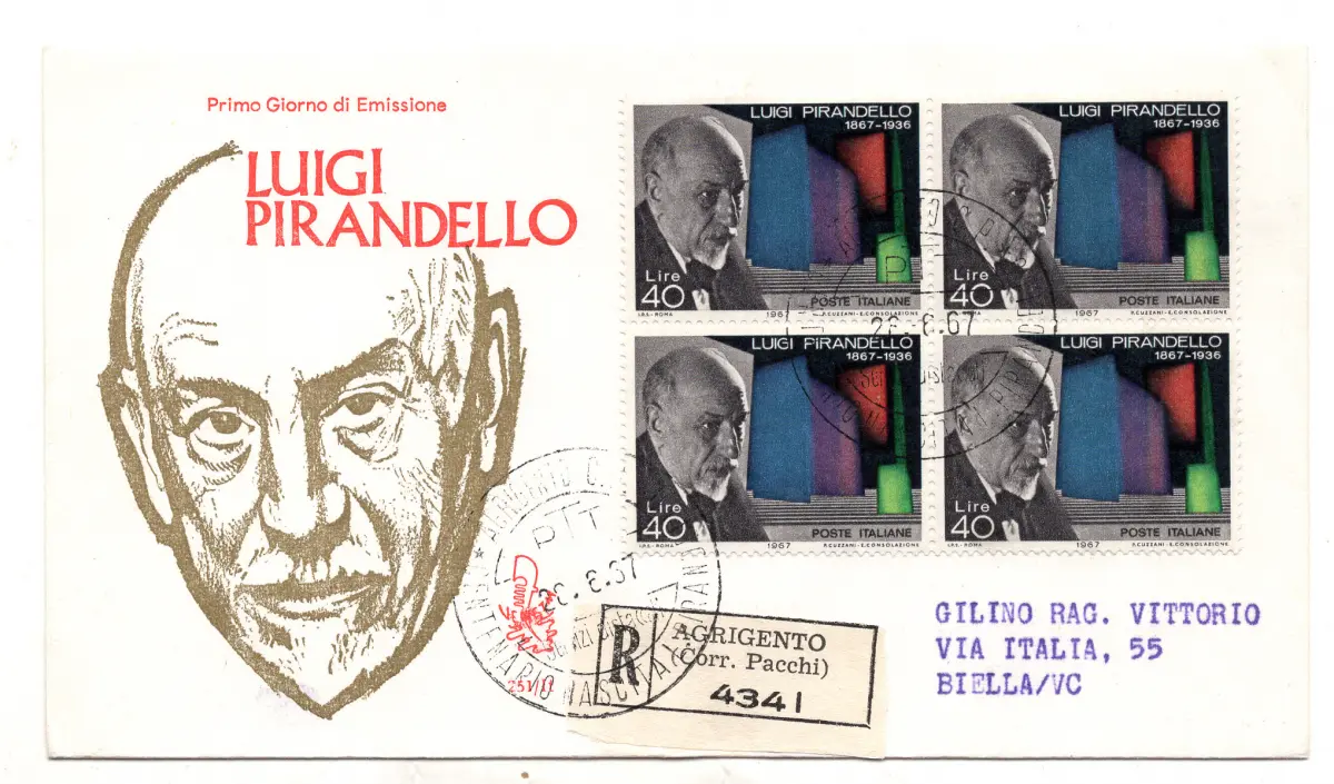 Italien FDC Venetia 1967 Pirandello Viertelreise Racc. für Italien Italien Italien 1967 Pirandello Viertel auf Reiseumschlag Racc. für Italien mit Annullierung der Ankunft Stornierung - Abfahrt Sonder Agrigento Cod. 765 / Venetien