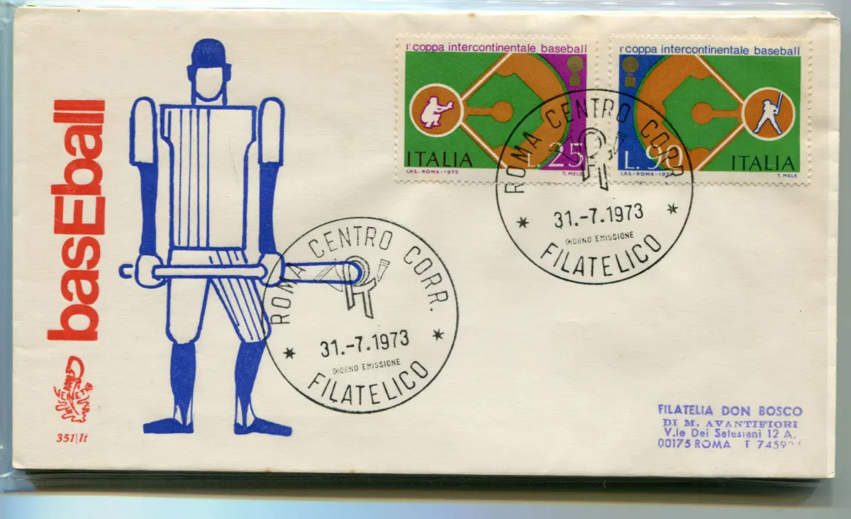 Italien FDC Venetia 1973 Baseball reiste nach Italien Italien 1973 Baseball auf Umschlag FDC reiste nach Italien mit Annullierung der Ankunft Annullo Roma Philatelico Cod. 1119/Venetia