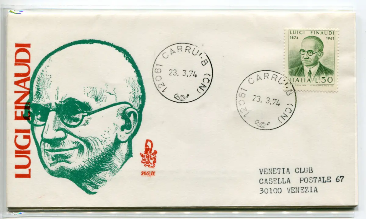 Italien FDC Venetia 1974 Einaudi reiste nach Italien Italien 1974 Einaudi auf FDC Umschlag reiste nach Italien mit Annullierung der Ankunft Annullo Carrù Cod. 1177/Venetia