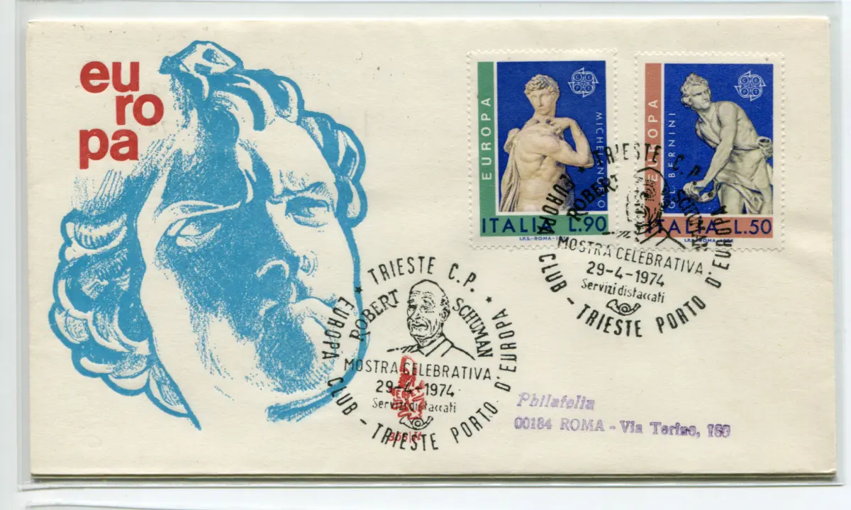 Italien FDC Venetia 1974 Europa reiste nach Italien Italien 1974 Europa auf FDC Umschlag reiste nach Italien mit AnnulloSpecial Triest - Europa Club Triest Porto d'Europa Cod. 1187/Venetia