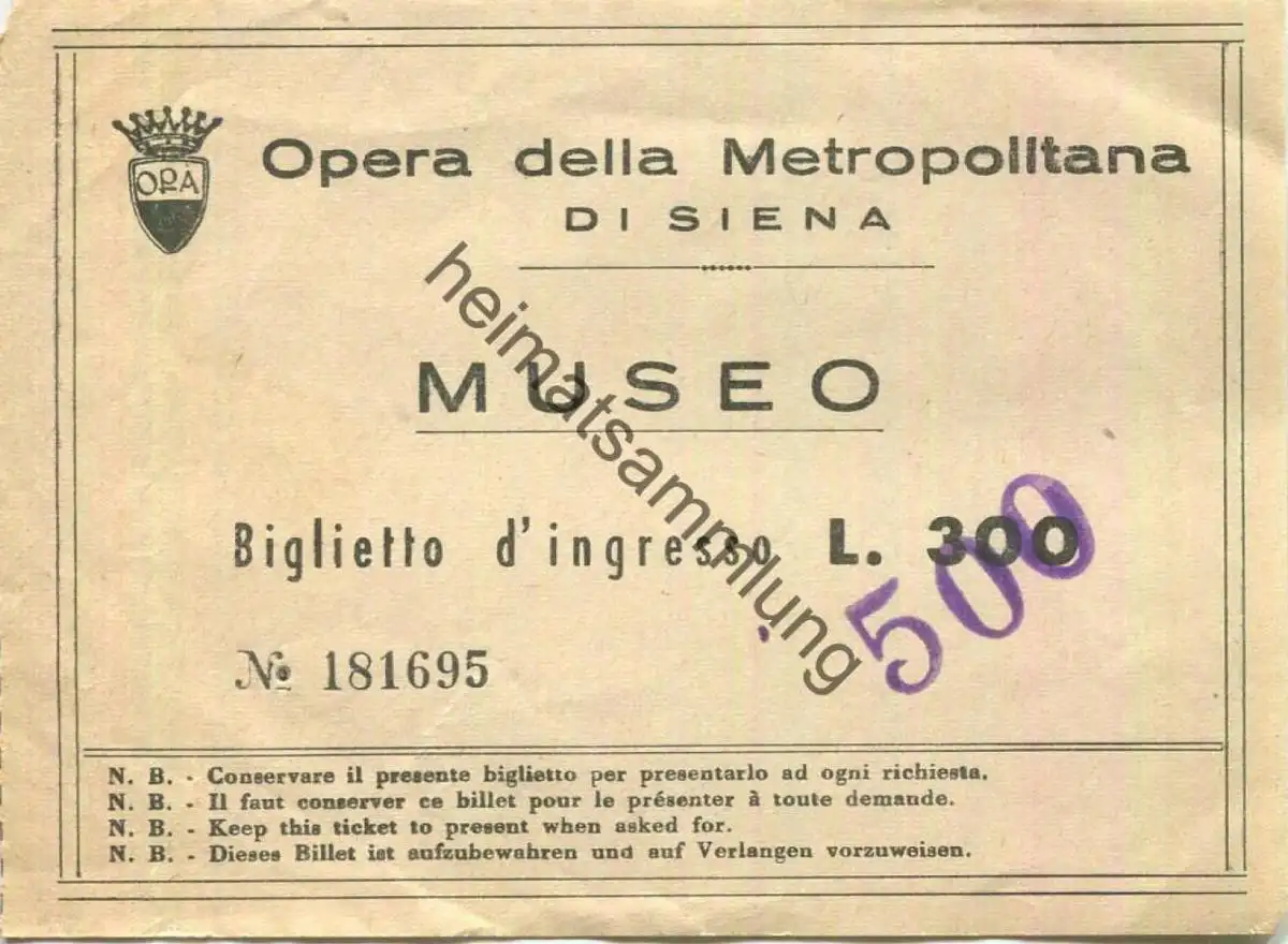 Italien - Opera della Metropolitana di Siena - Museo - Biglietto d'ingresso L. 500