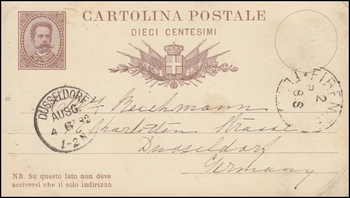 Italien Postkarte P 6 König Humbert I. von FIRENZE 2.8.82 nach DÜSSELDORF 4.6.82