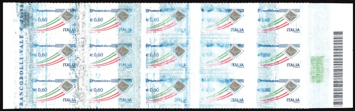 MNH - Vollgummi - Italienische Post Euro 0,60 Flugbrief Nr. 3102 Block von fünfzehn Exemplaren mit Barcode - verwirrende ölige Drucksorte der Farbe Blau und Grün - Durch diese starke Öligkeit erscheint der Druck auf der Rückseite - auffällig und selten für Sammler von Sorten mit Barcode - Unwiederholbar Cod. 957/17
