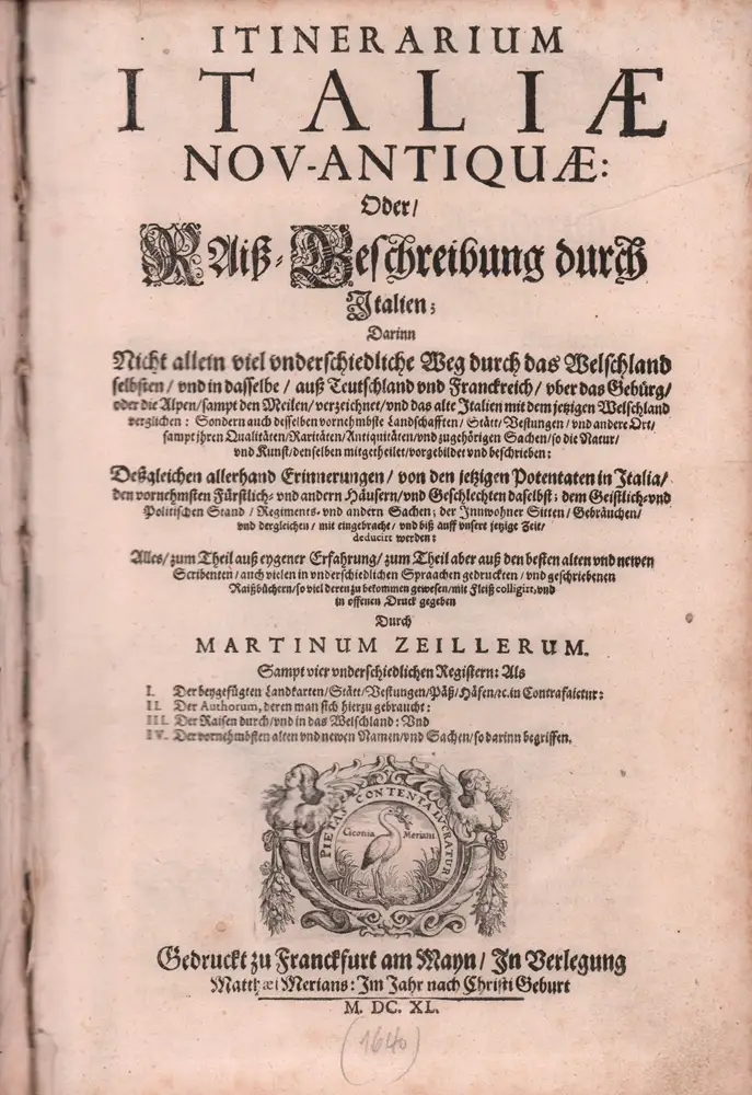 Titel: Itinerarium Italiae Nov-Antiquae: Oder, Raiß-Beschreibung durch Italien; Darinn Nicht allein viel underschiedliche Weg durch das Welschland selbsten... Sondern auch desselben ... Landschafften, Stätt, Vestungen, ... sampt ihren Qualitäten ... und zugehörigen Sachen ... vorgebildet und beschrieben. Deßgleichen allerhand Erinnerungen, von den jetzigen Potentaten in Italia... Alles, zum Theil auß eygener Erfahrung, zum Theil aber auß... den besten alten und neuen Scribenten... mit Fleiß colligirt, und in offenen Druck gegeben Durch Martinum Zeillerum. Sampt vier underschiedlichen Registern. - NUR TEXT ! -