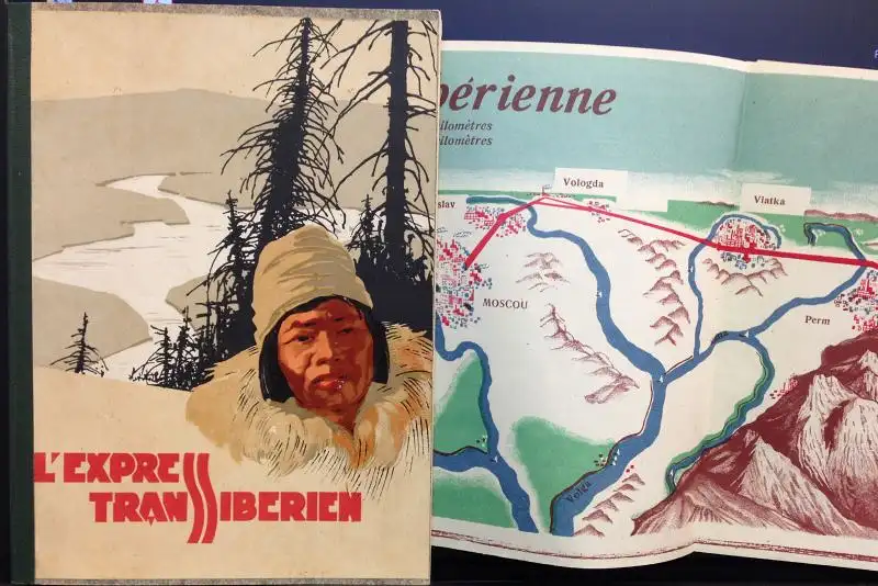 Moskau, Intourist, (1933), 29 S., 1 Bl. Mit zahlreichen Abbildungen und 1 mehrfach gefalt. farbigen Streckenplan. 8°, neuer flexibler Halbleinenband mit aufgez. farb. OVorderumschlag und eingeb. farb. ORückendeckel.