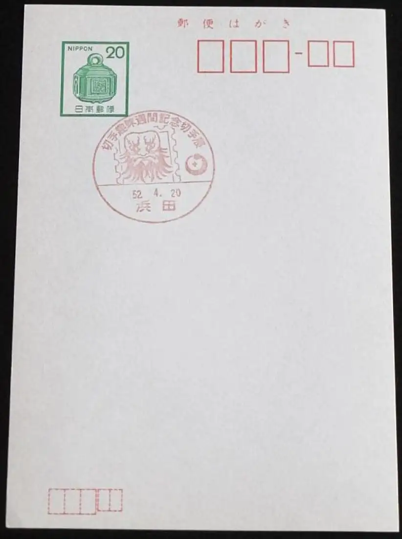 JAPAN GANZSACHE POSTKARTE mit Sonderstempel 20.04.1977 BRIEFMARKENAUSSTELLUNG 52.04.20