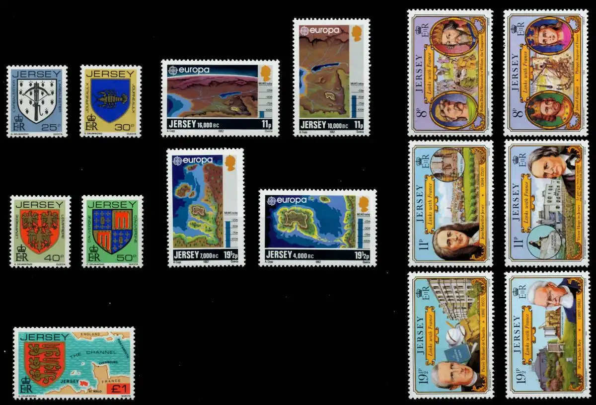 Jersey, Jahrgang 1982, die Einzelmarken aus den Zusammendrucken können auch als Paare enthalten sein. Bei den Freimarken kann Zähnung A oder C bzw. auch gemischt enthalten sein.