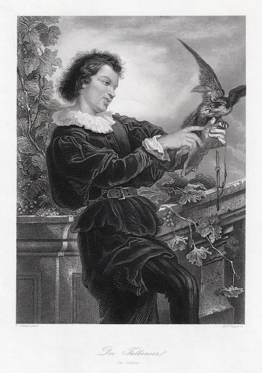 Jagd, Falkner: Der Falkenier. Echter Stahlstich, Payne um 1860