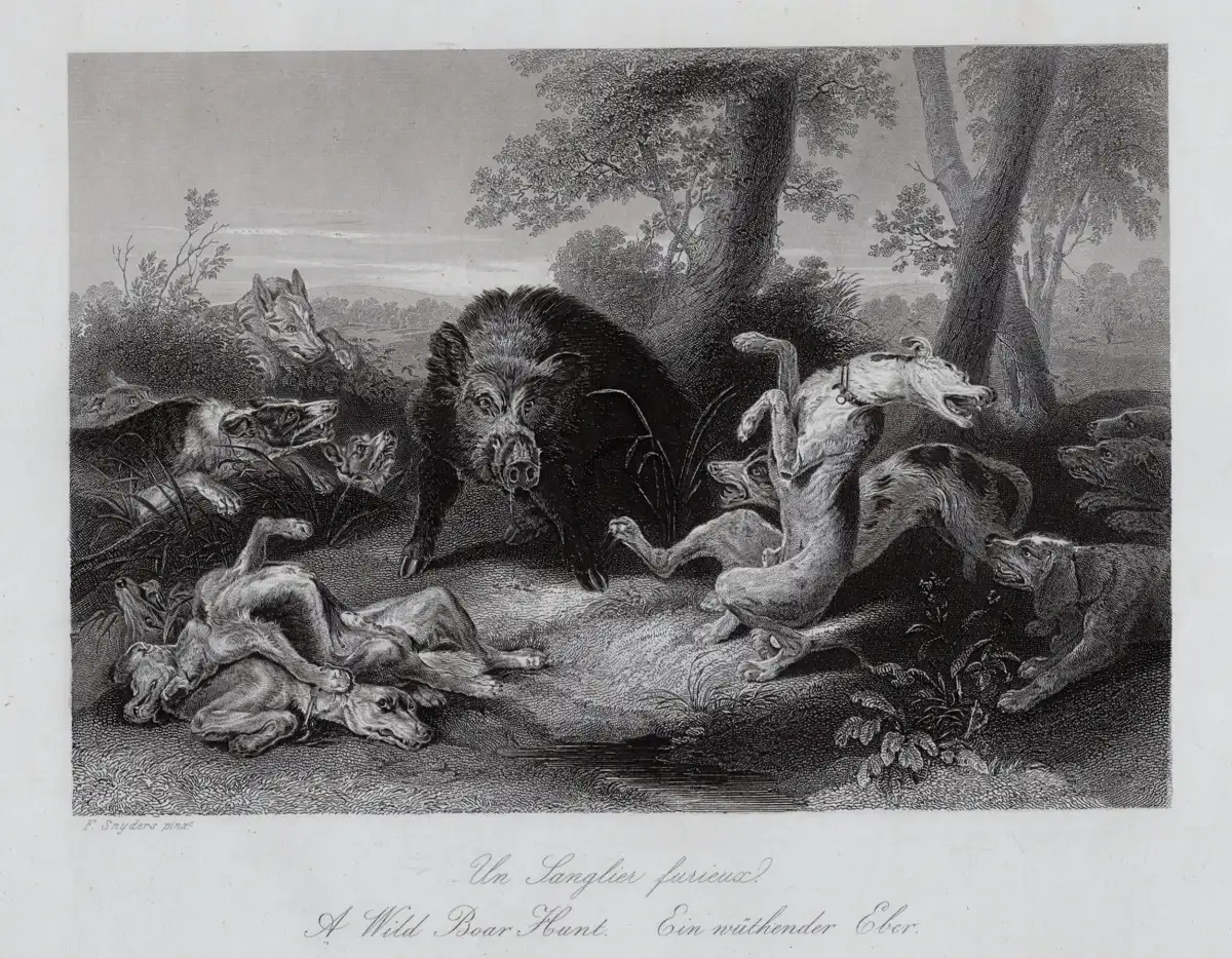 Jagdhunde: Ein wütender Eber, originaler Stahlstich, Haewood um 1850