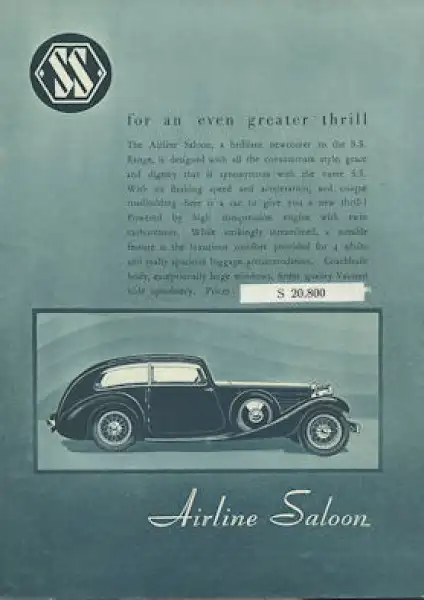 6 Seiten 29 x 21 cm Modelle SS 1 mit 2143 ccm und 2663 ccm, Airline, Saloon und Offener 4-Sitzer, Modelle SS 2 mit 1343 ccm und 1608 ccm, Saloon und Offener 4-Sitzer Englischer Text Guter Zustand, Einklebungen eines östereichischen Importeurs