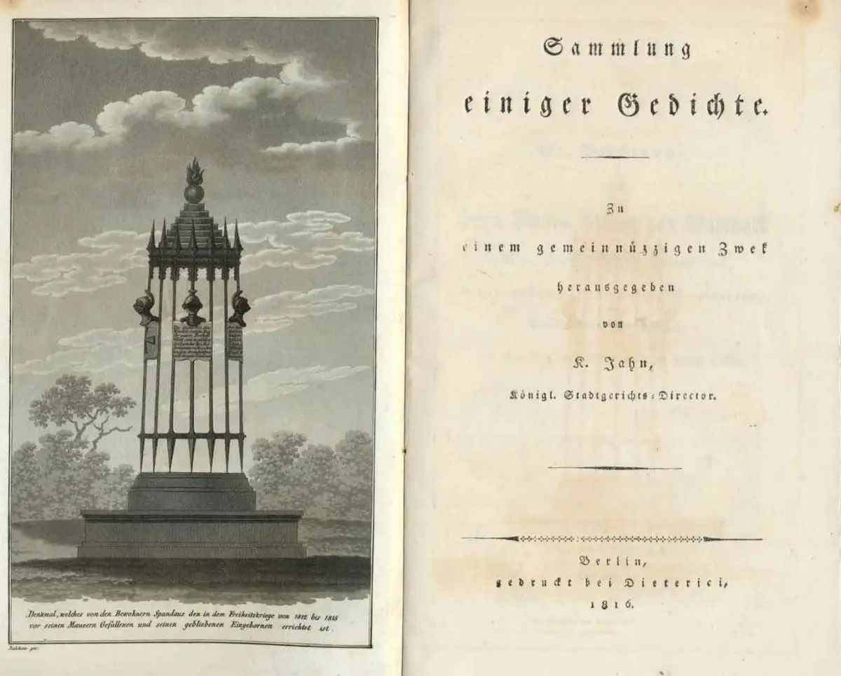 Erste Ausgabe. Selten. Erschien als werbende Schrift des kgl. Stadtgerichtsdirektors zur Sammlung von Geldern, um das Denkmal für die Gefallenen der Freiheitskriege aus Spandow (Spandau bei Berlin) errichten zu können. Mit einer sehr detaillierten Abbildung des Denkmals.