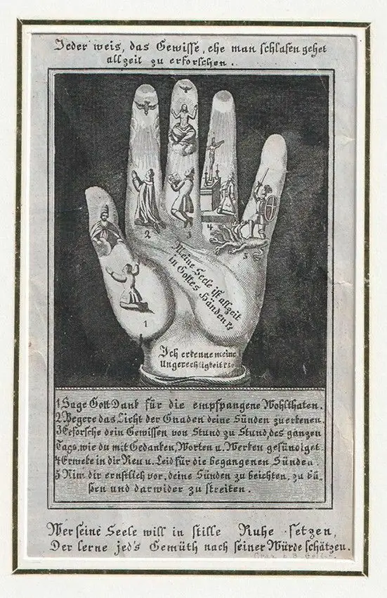 Bemerkungen: Mit einer Hand vor dunklem Grund wird eine Abendandacht in fünf Schritten visualisiert. An jedem Finger sind kleine Darstellungen zu sehen, die den Andachtstext im darunterliegenden Feld illustrieren. Auf der Handfläche ist zu lesen Meine Seele ist allzeit in Gottes Händen und am Handgelenk Ich erkenne meine Ungerechtigkeit.