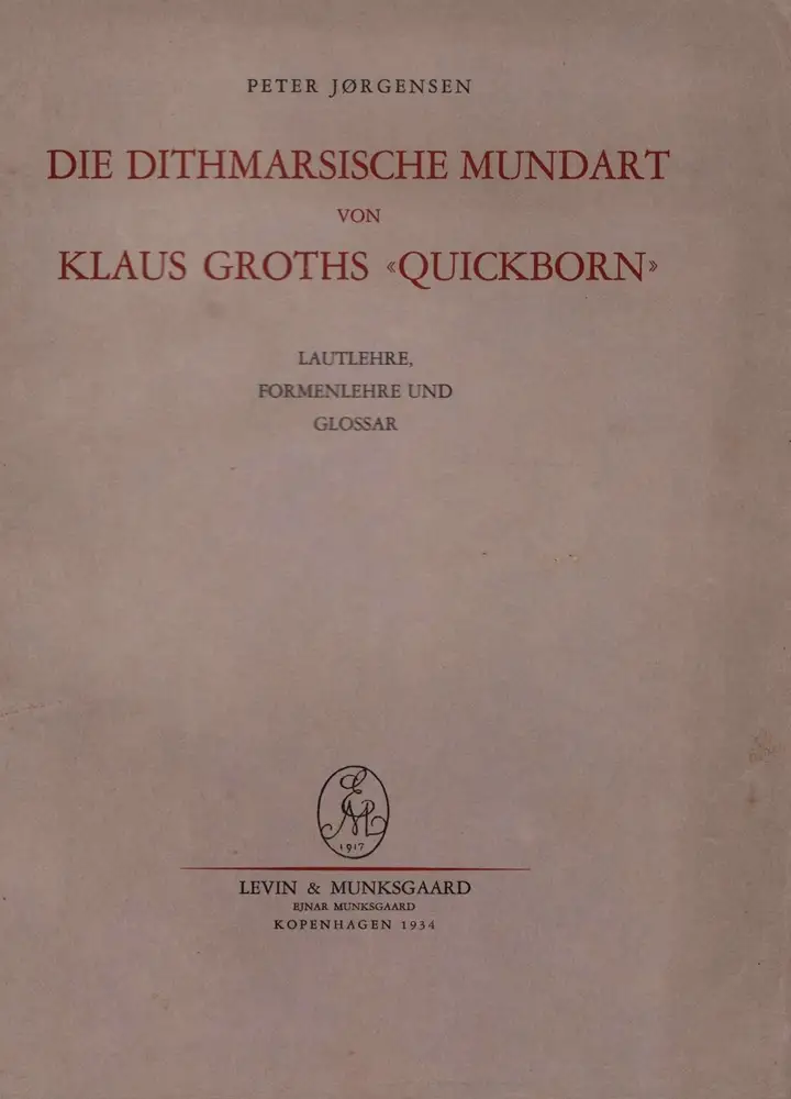 Jörgensen, Peter: Die Dithmarsische Mundart von Klaus Groths "Quickborn". Lautlehre, Formenlehre und Glossar.