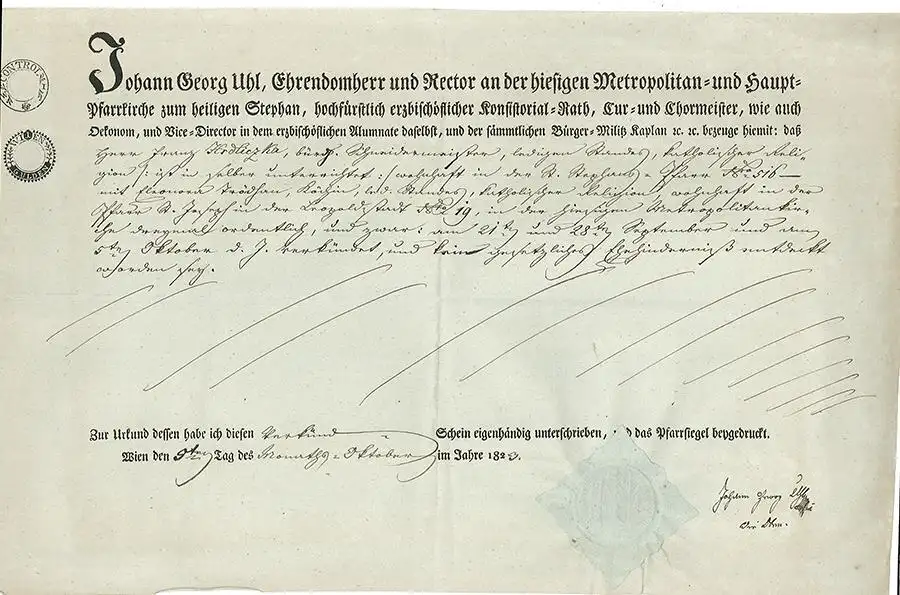 Bemerkungen: Verkündschein für den Schneidermeister Franz Hrdliezka und seiner Verlobte, die Köchin Eleonora Trödhan, der von Johann Georg Uhl, Domherrr von St. Stephan am 5. Oktober 1823 ausgestellt wurde. Am linken Rand mit einem "Control"-Stempel u. einem Wertstempel versehen.