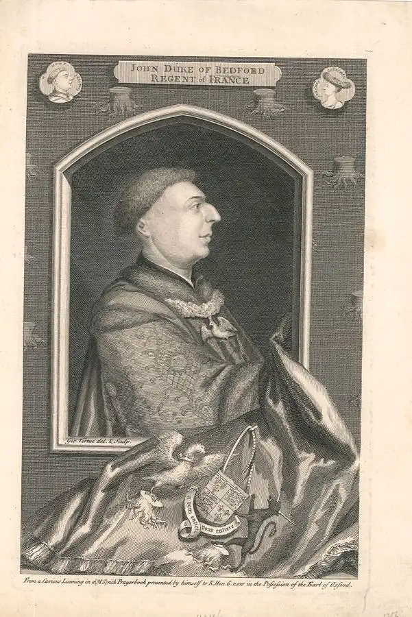 Bemerkungen: Portrait des Dukes of Bedford (1389-1435) nach der Minitur des Stundenbuches "Bedford Hours" (heute British Museum). Unterer Plattenrand mit dem gestochenen Vermerk: "From a Curious Limning in a (MS) rich Prayerbook presented by himsef to K. Hen. 6 now in the Possesion of the Earl of Oxford".