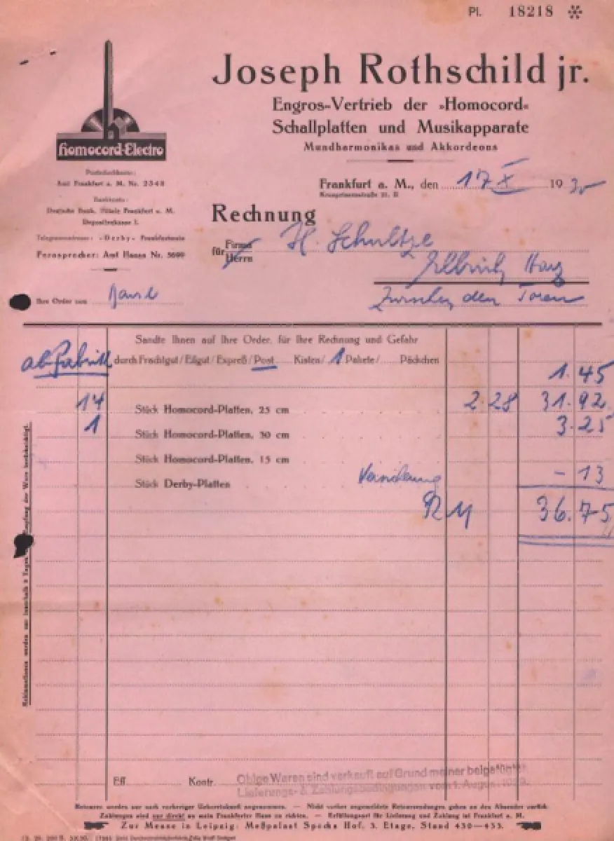 1 Seite DinA4 Schallplatten und Musikapparate, Frankfurt a.M., Kronprinzenstr. 21 Leichte Gebrauchsspuren, gelocht