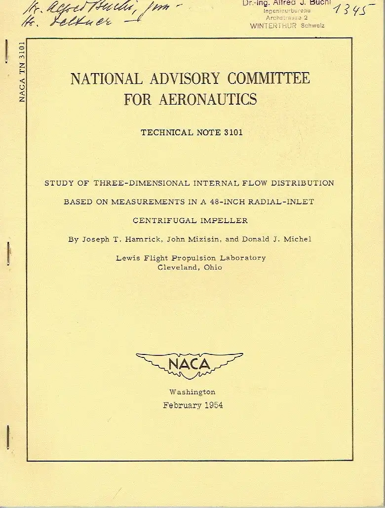 sehr guter Zustand, geringe Gebrauchs- und Alterungsspuren: Deckel und erste Textseite mit altem Stempel, Deckel auch noch mit Nummer und Notiz - Seiten sauber und ordentlich, A study of the loss and velocity distribution in a radial flow impeller was made. It is indicated that secondary flows within the boundary layer and leakage through the blade-to-shroud clearance space result in a concentration of low-energy air at approximately 80 percent of the passage width from the pressure face at the shroud. Comparison of the data from internal measurements made for the impeller of this investigation with hot-wire anemometer studies made at the outlet of a similar impeller indicates that much can be learned about the internal flow picture with hot-wire surveys alone, kartoniert, ca. 19,5 x 26, 64 Seiten mit Diagrammen, 11 Bildern und 8 Karteikarten