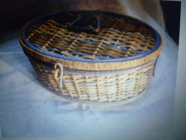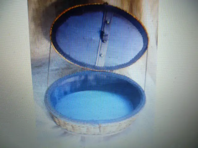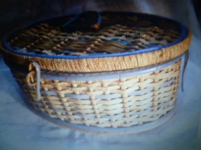 Jugendstil 1915-25 Übergang ins Art Deco Schmuck oder auch als Nähschatulle verwendbar Bastgeflecht mit verschiedenen Mustern unter Anderem Zopfmuster , mehrfarbig abgesetzt , ovaler Korpus elegante Form .