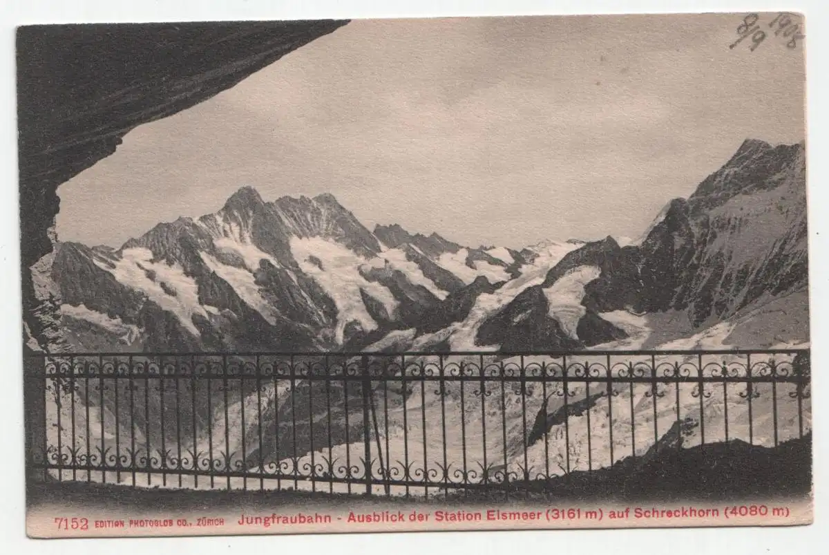 Jungfraubahn Ausblick der Station Eismeer (3161 m) auf Schreckhorn (4080 m). circa 1905