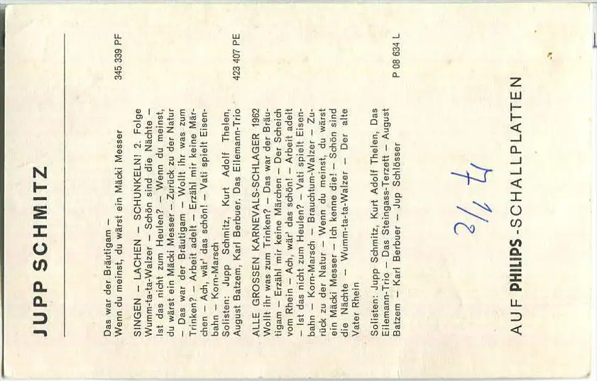 Jupp Schmitz - original Autogramm - Deutschlands bekanntester Karnevalist Komponist und Sänger: "Wer soll das bezahlen" - "Wir kommen alle alle alle in den Himmel" - keine AK - leicht bügig (E37822)