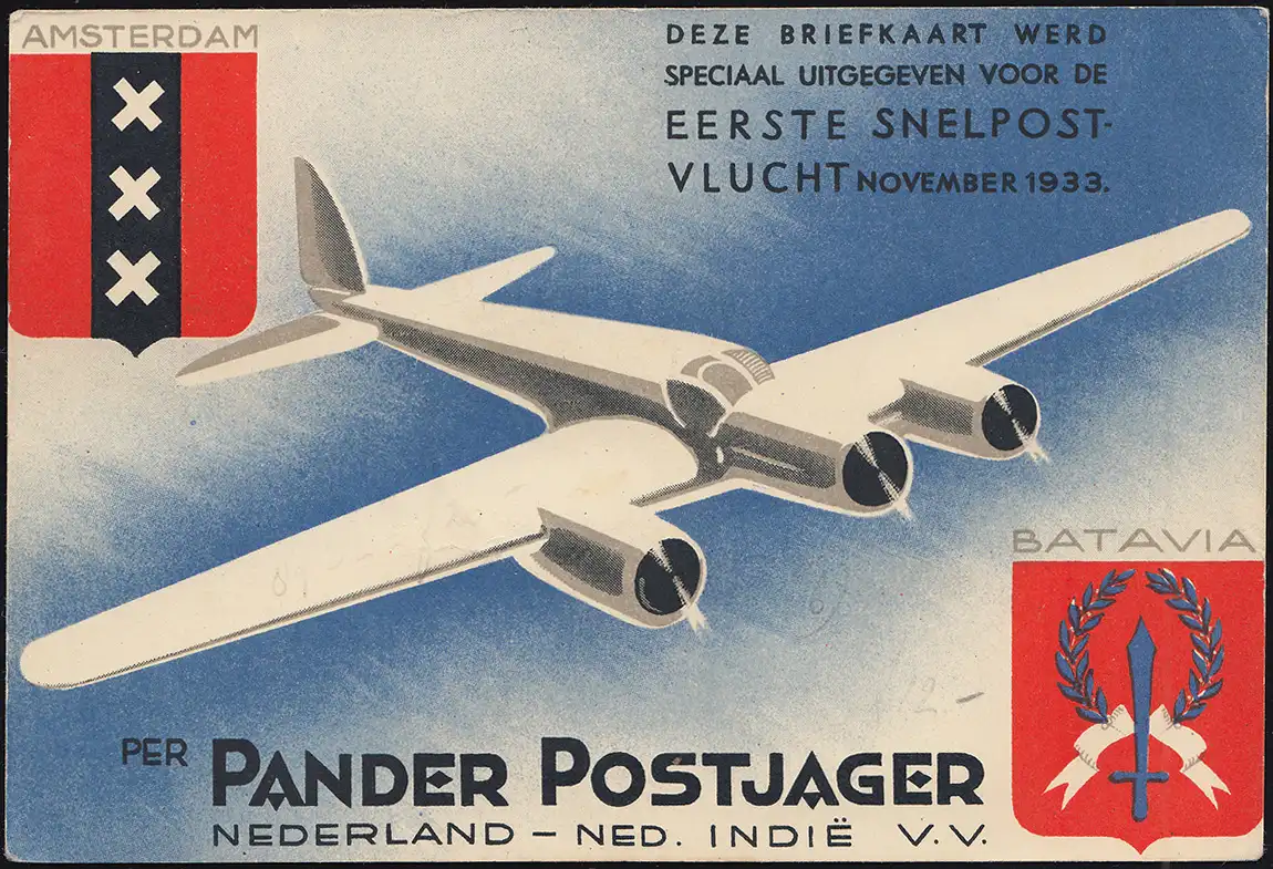 KLM-Ansichtskarte "PANDER POSTJAGER AMSTERDAM - BATAVIA EERSTE SNELPOST-VLUCHT NOVEMBER 1933" mit grauem Text. Schwacher Bordstempel auf der unteren Flugpostmarke. Befördert mit PH-OST Postjager nach Brindisi (Notlandung). Dann mit Imperial Airways nach Kairo und weiter per KLM und Pelikaan nach BANDOENG 22.12.1933.