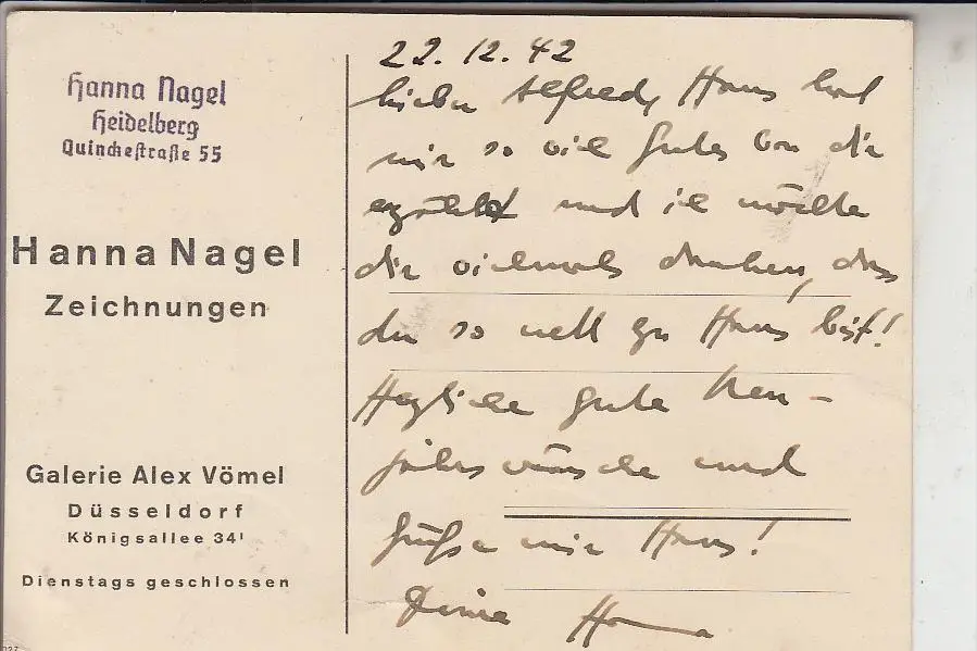 KÜNSTLER / ARTIST - Hanna Nagel, Heidelberg, Zeichnung und Schreiben mit Autograph